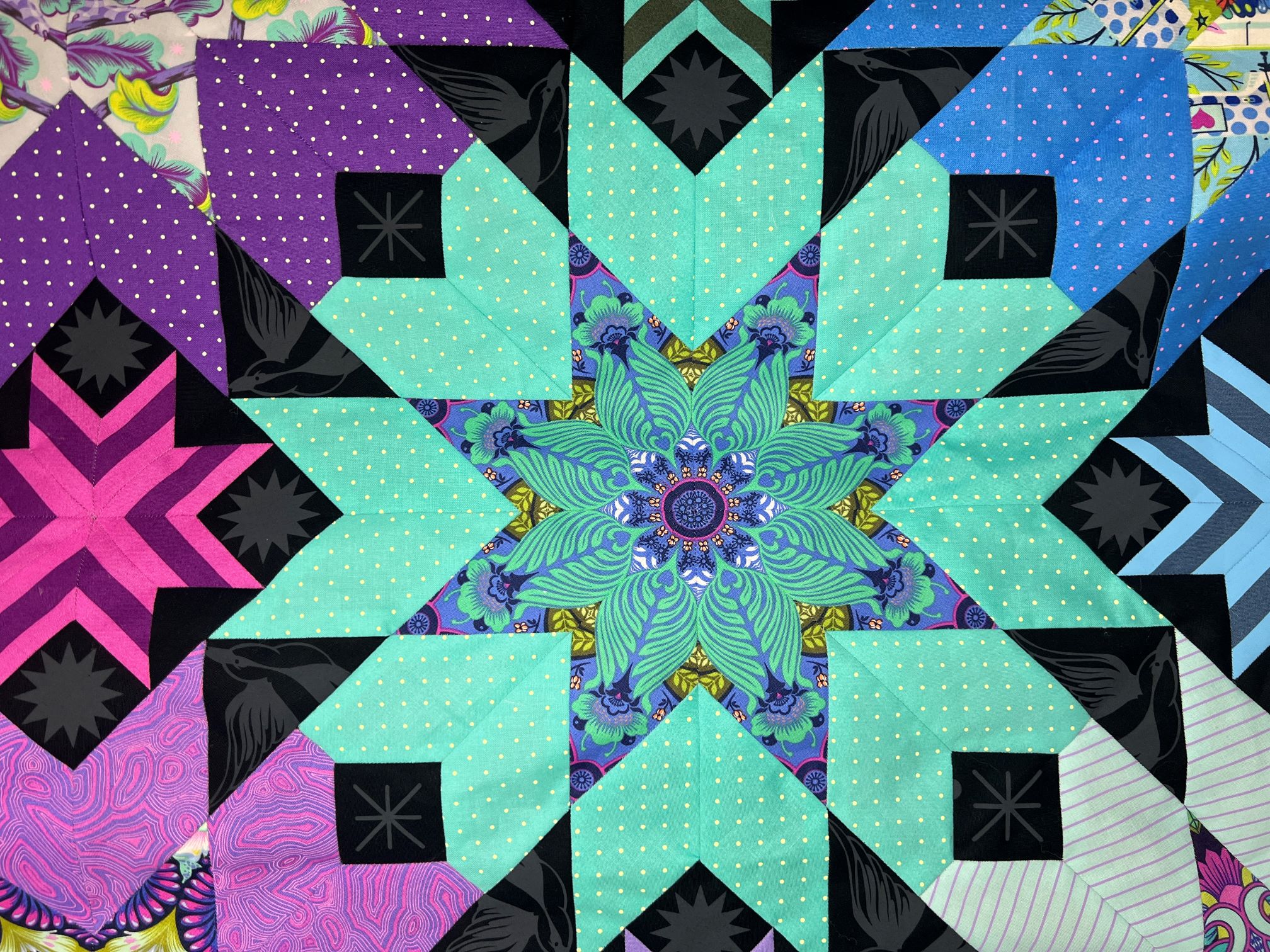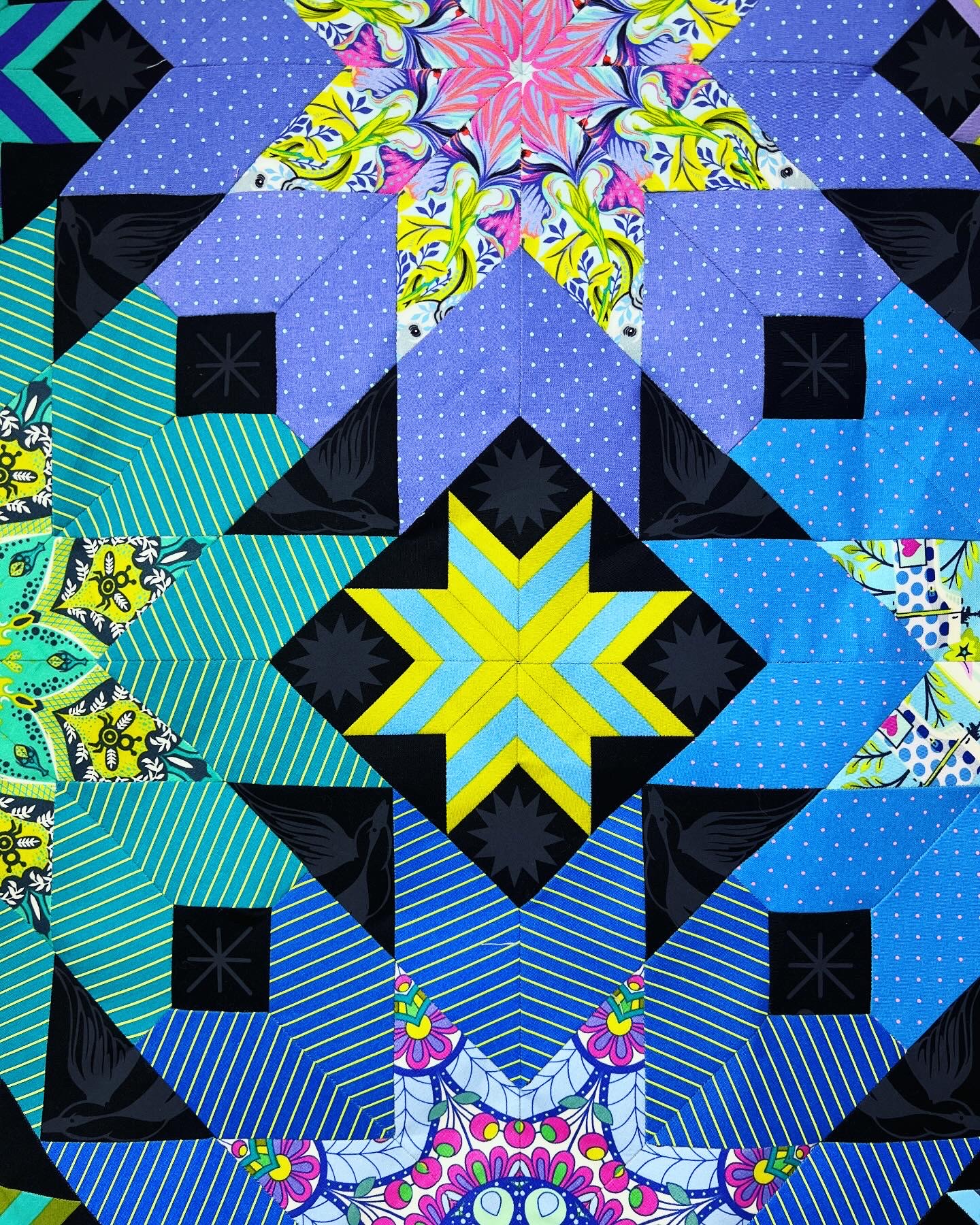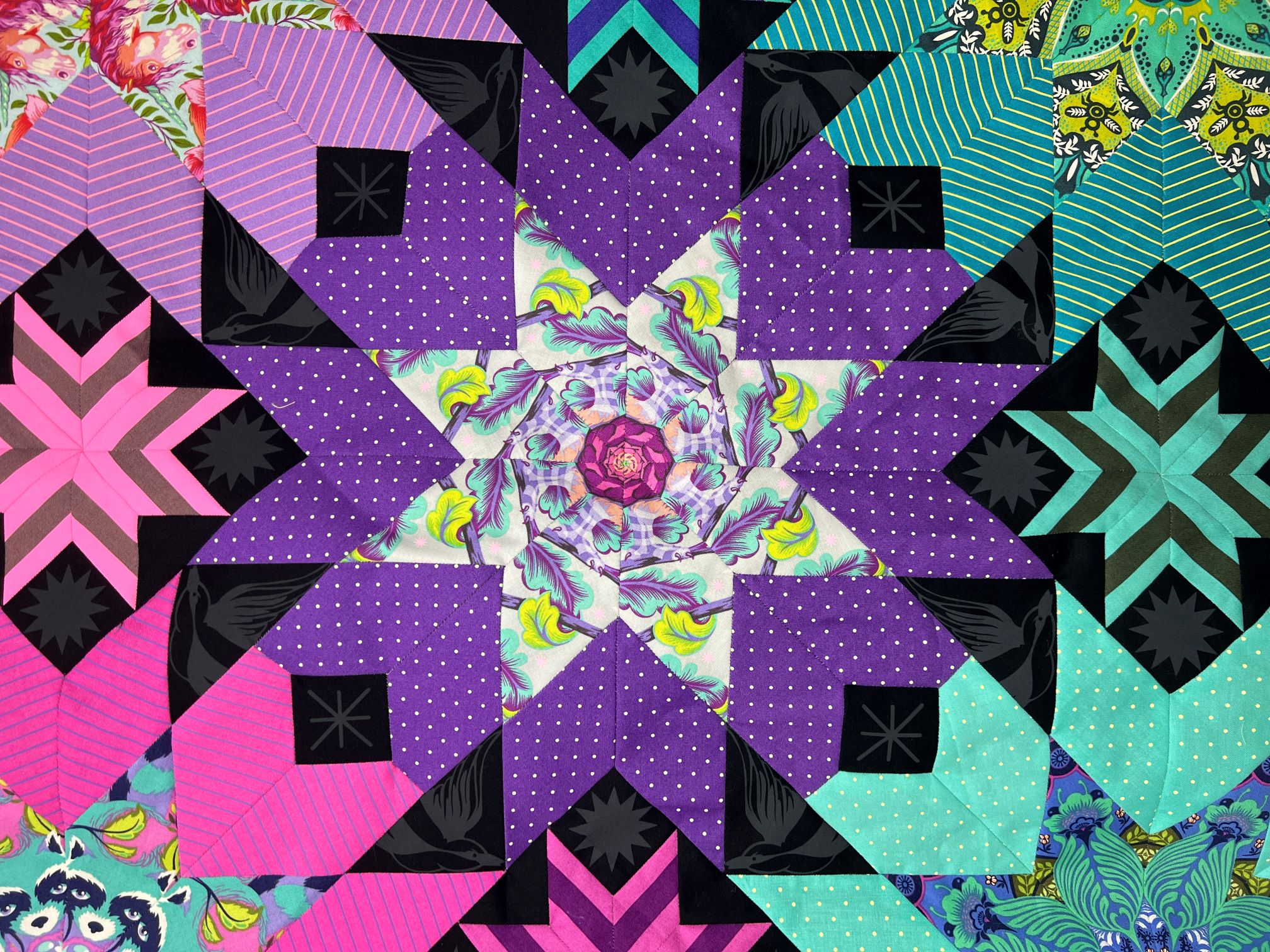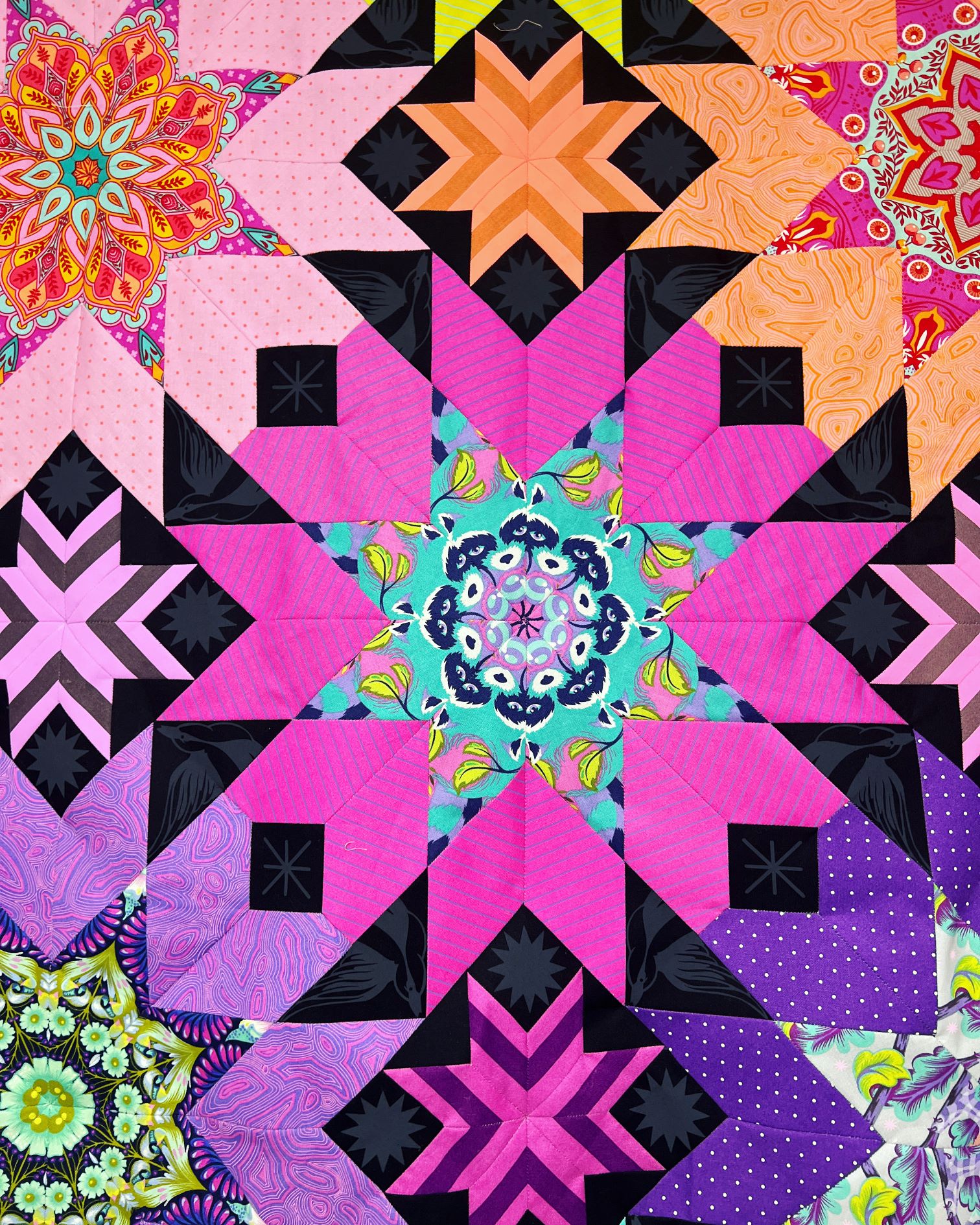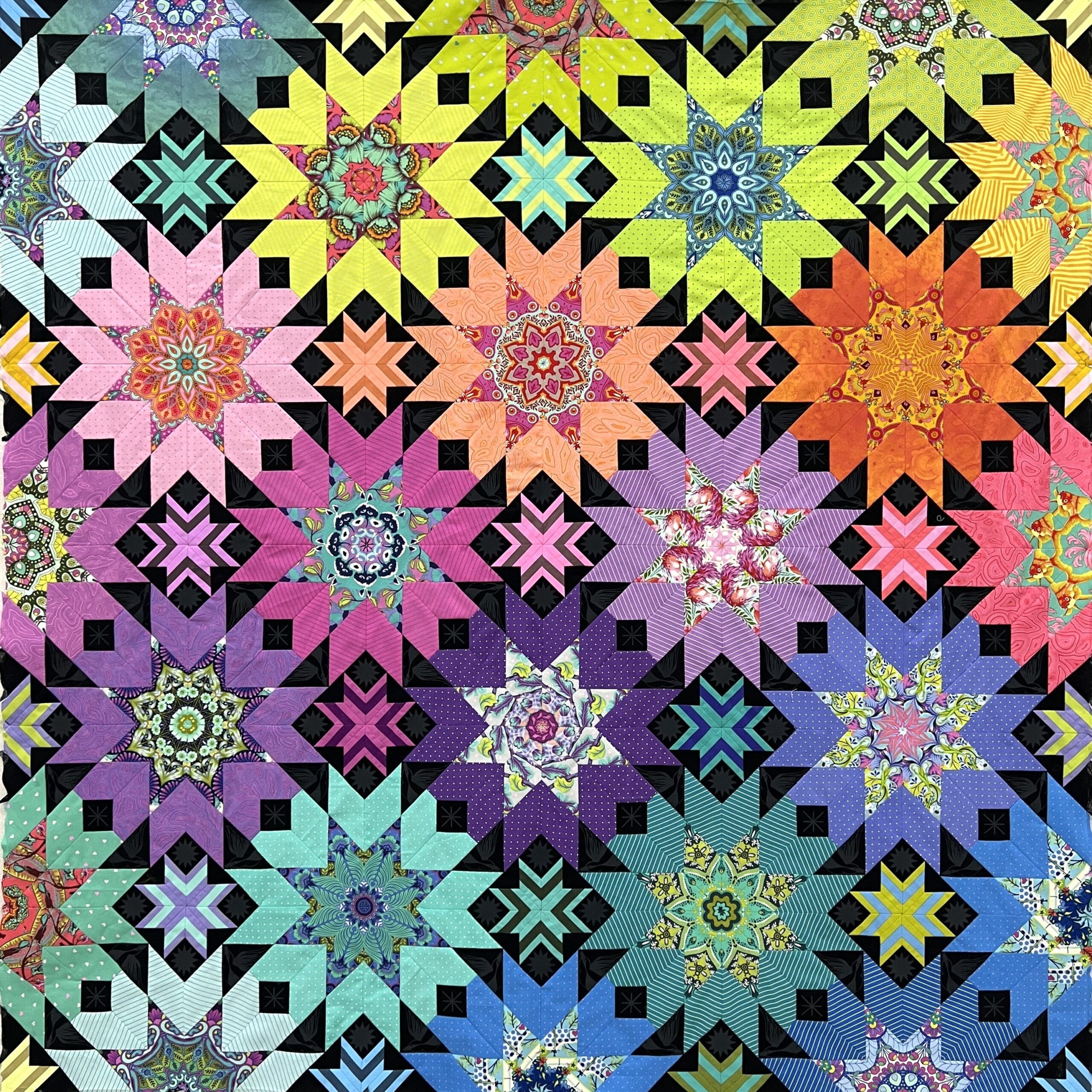The Divination EPP quilt is a fun and unique English Paper Piecing Pattern. The simple, yet bold design allows you to build your sewing and quilting skills, while still providing a big impact. Try this pattern with solids or stripes for a modern take. Fabrics requirements are calculated using solids so you have a starting point for how much fabric you may need for the quilt, along with backing construction methods for each. This pattern is great for your favorite fabrics to really make them shine! Fussy cutting your fabrics will make this quilt the star of the show. Fabrics used for the cover quilt are from various Tula Pink fabric lines and mostly Tula Pink True Colors or Tiny Coordinates for the surrounding outer stars. Fairy Flakes Ink was used for the “background” fabric.