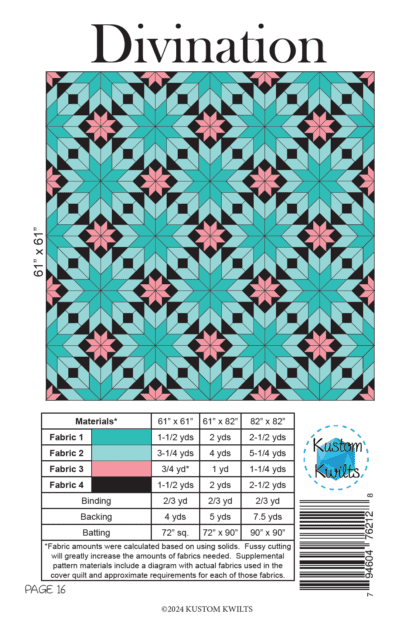 - A full color diagram of the cover quilt with SPECIFIC fabrics that were used in the cover quilt, along with fabric requirements for all 58 unique fabrics used in the quilt.