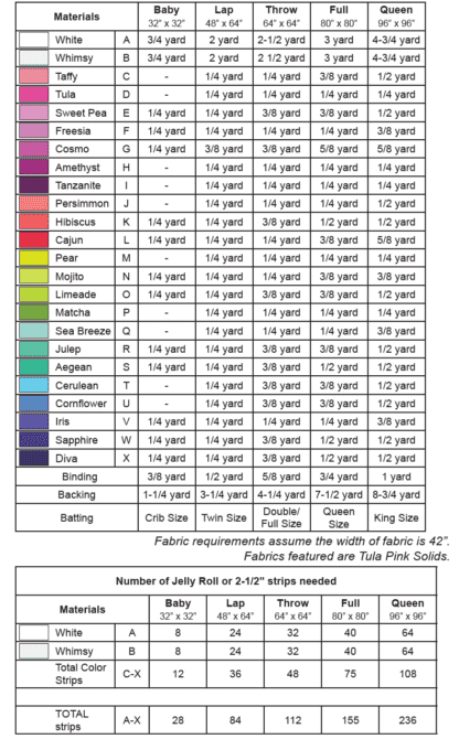 The Rainbow Ripples quilt pattern features five different options including baby, lap, throw, full, and queen sizes. Rainbow Ripples is jelly roll friendly and is a great way to showcase your favorite colors!
