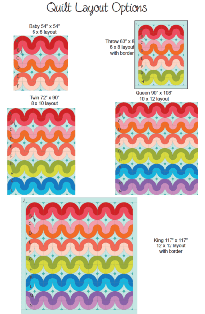 The Retro Groove quilt pattern features five different options, including baby, throw, twin, queen, and king sizes. The Retro Groove pattern is fantastic for showcasing big, bold prints. Check out the amazing tester Retro Groove quilts in the photo gallery!