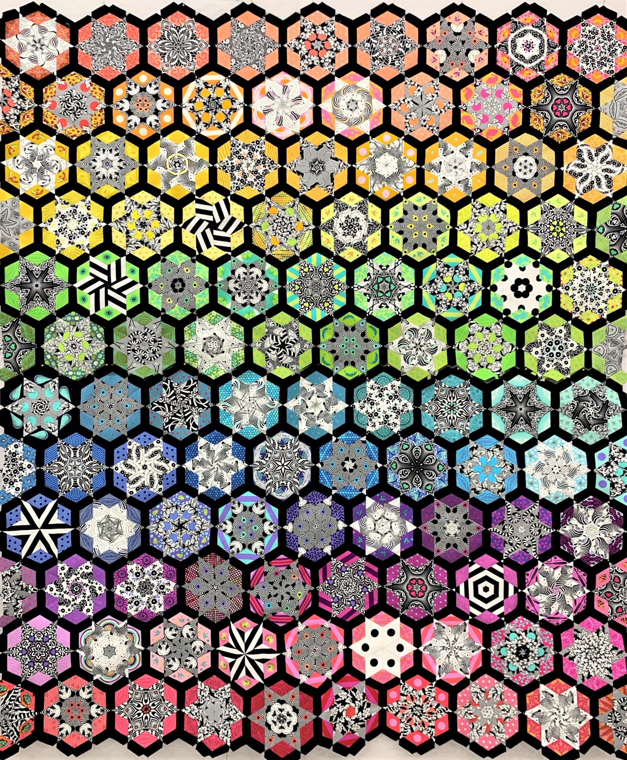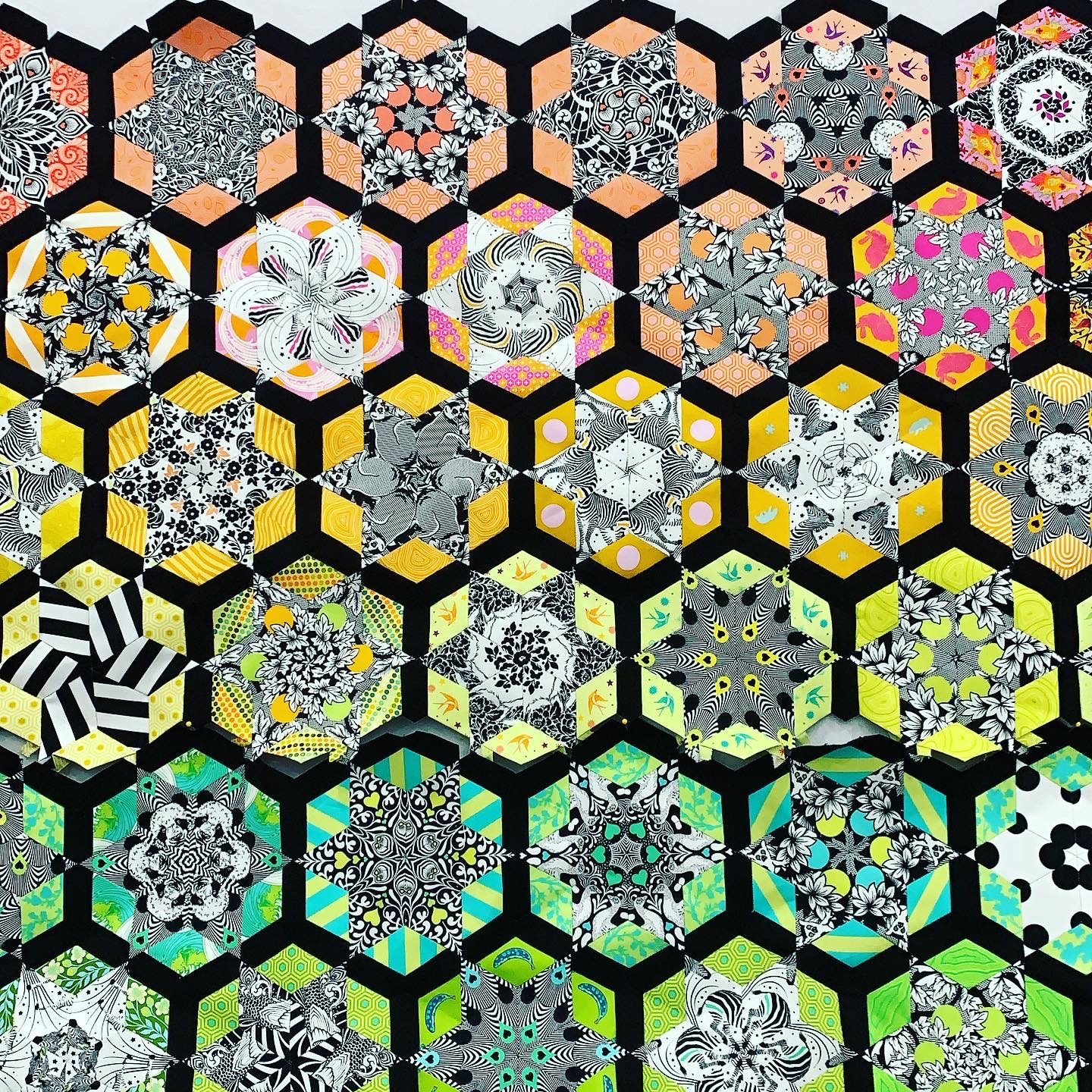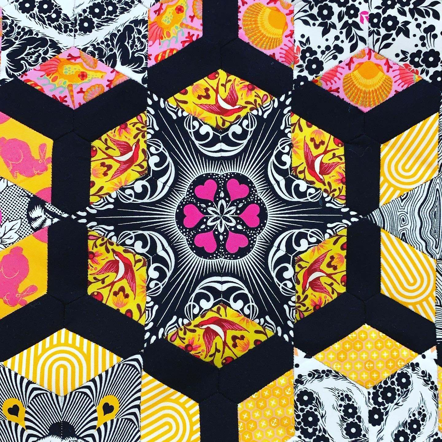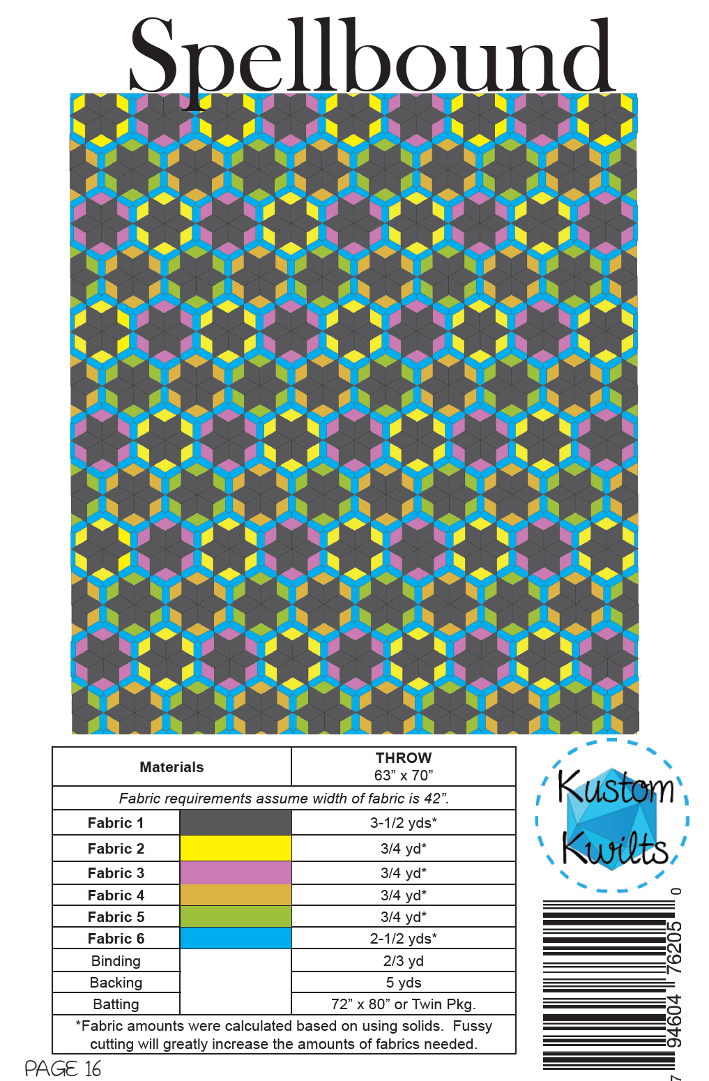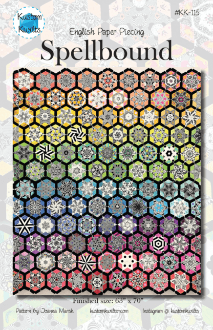 The Spellbound EPP quilt is a fun and unique English Paper Piecing Pattern. The simple, yet bold design allows you to build your sewing and quilting skills, while still providing a big impact. Try this pattern with solids or stripes for a modern take. Fabrics requirements are calculated using solids so you have a starting point for how much fabric you may need for the quilt, along with backing construction methods for each. This pattern is great for your favorite fabrics to really make them shine! Fussy cutting your fabrics will make this quilt the star of the show. Fabrics used for the cover quilt are Tula Pink Linework for the center stars and various Tula Pink fabric lines for the surrounding outer stars. Kona cotton Black was used for the stretched hexagons that outline each star set.
